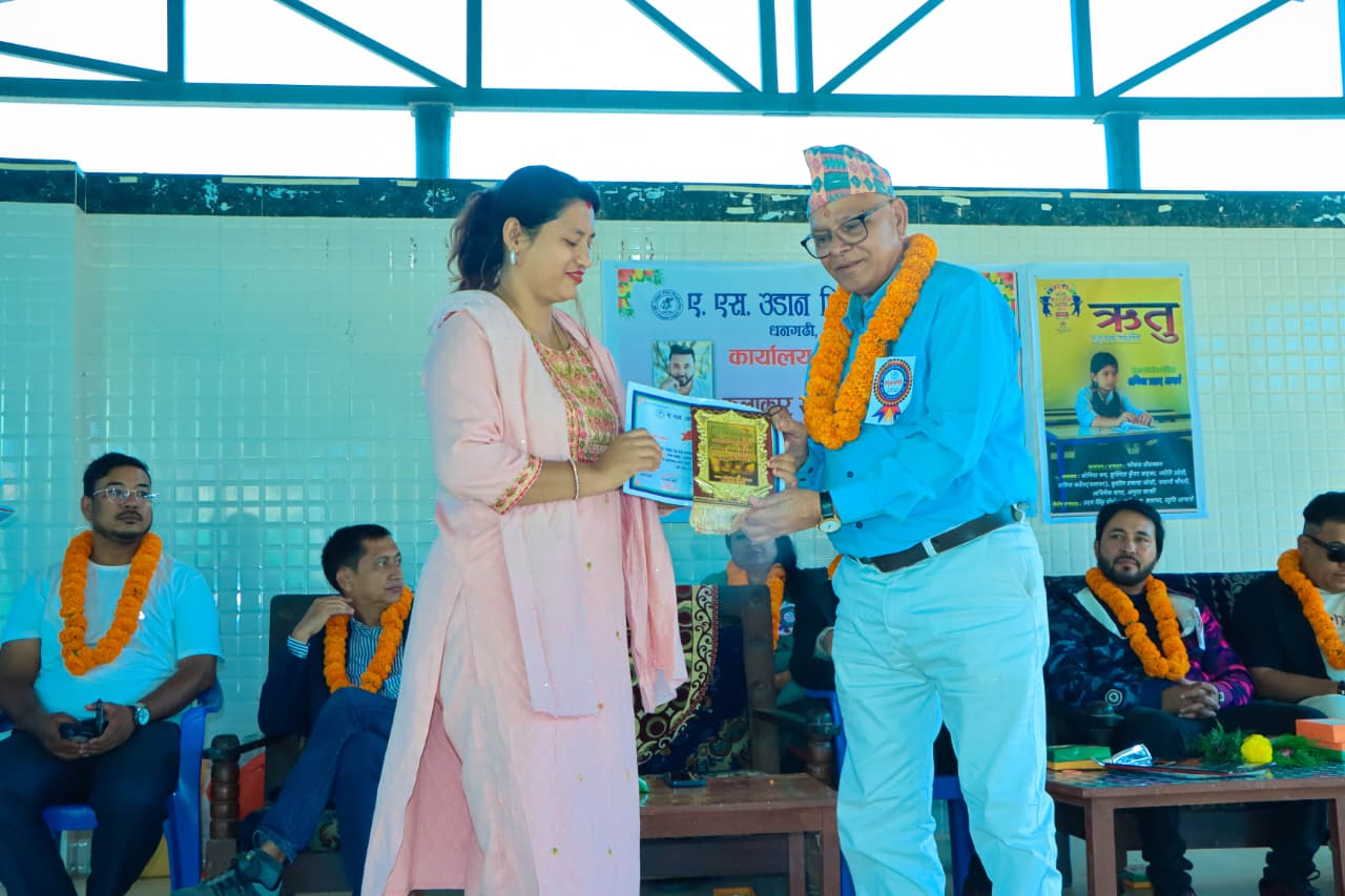 धनगढी । ए. एस. उडान फिल्म प्रोडक्सन धनगढी कैलालीले निर्माण गरेको ऋतु बाल लघु राष्ट्रिय चलचित्रका कलाकारहरुलाई आइतबार धनगढीमा सम्मानित गरिएको छ । प्रतिनिधि सभाका सदस्य डिल्लीराज पन्त र सुदुरपश्चिम प्रदेश सभाका सदस्य धर्मराज पाठकले कलाकारहरुलाई प्रशंसापत्र प्रदान गरेका हुन् ।