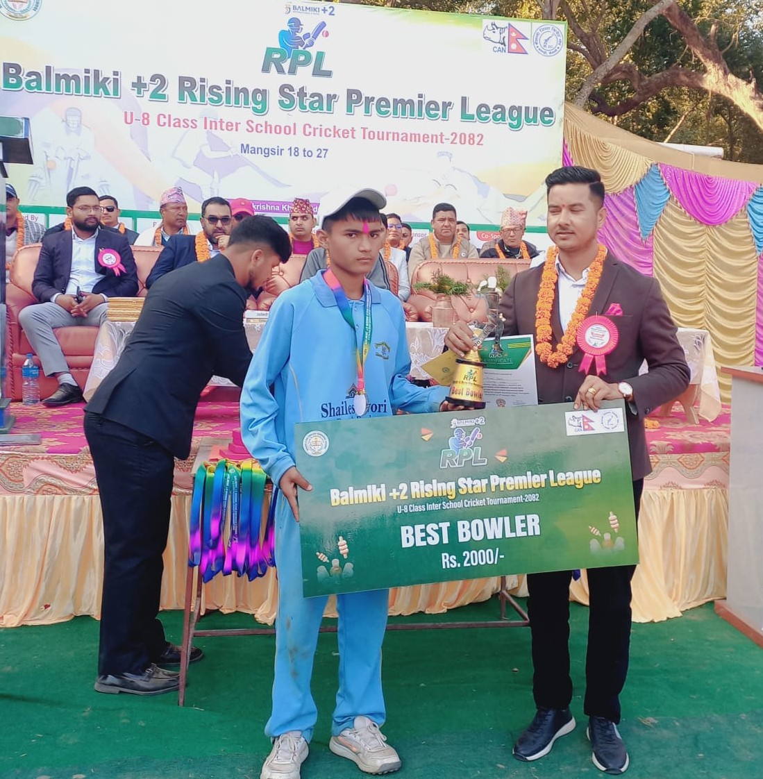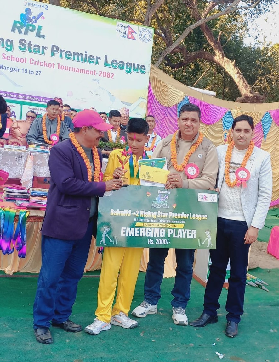 प्रतियोगिताका उत्कृष्ट खेलाडीको पुरस्कार स्टेपिङ स्टोनका बिकास धामीले, प्रतियोगिताका इमर्जिङ खेलाडीको पुरस्कार राइजिङ स्टारका अविनाश भट्टराईले, प्रतियोगिताका उत्कृष्ट ब्याट्सम्यानको पुरस्कार विद्याभुषणका विज्ञान बोहराले, उत्कृष्टको बलरको पुरस्कार स्टेपिङ स्टोनका निर्मल बोगटीले प्राप्त गरेका छन् ।