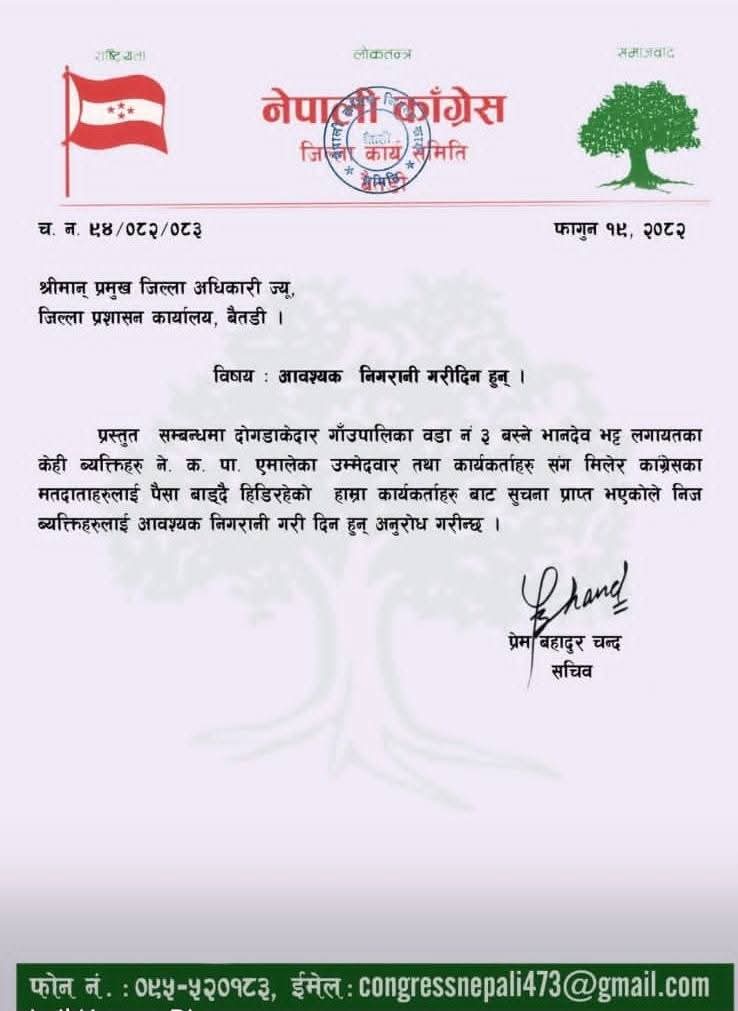 बिपक्षी पार्टीका उम्मेदवारसँग मिलेर आप्mनै पार्टीका कार्यकर्तालाई रकम बितरण गरिरहेका आप्mना एक कार्यकर्तालाई नेपाली कांग्रेस बैतडीले पार्टीबाट कारवाही गरेको छ । प्रहरीले नगर रकम र निर्वाचन सामाग्री सहित पक्राउ गरेपछि नेपाली काँंग्रेसले दोगडाकेदार गाउँपालिका–३ खोचलेकका ५२ बर्षीय भानदेव भट्टलाई साधारण सदस्यबाट कारवाही गरेको हो ।