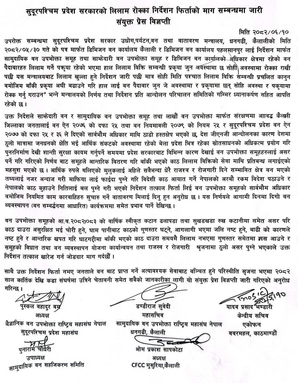 संयुक्त विज्ञप्तिमा भनिएको छ, ‘प्रदेश सरकारले विभिन्न कारण देखाई वन उपभोक्ता समुहहरुलाई असर पर्ने गरि गरिएको निर्णयबाट समुहले आन्तरिक वितरण गरि बाकी भएको काठ लिलाम बिक्रीको सेवामाथि प्रतिवनध लगाइएको महशुश भएको छ ।’